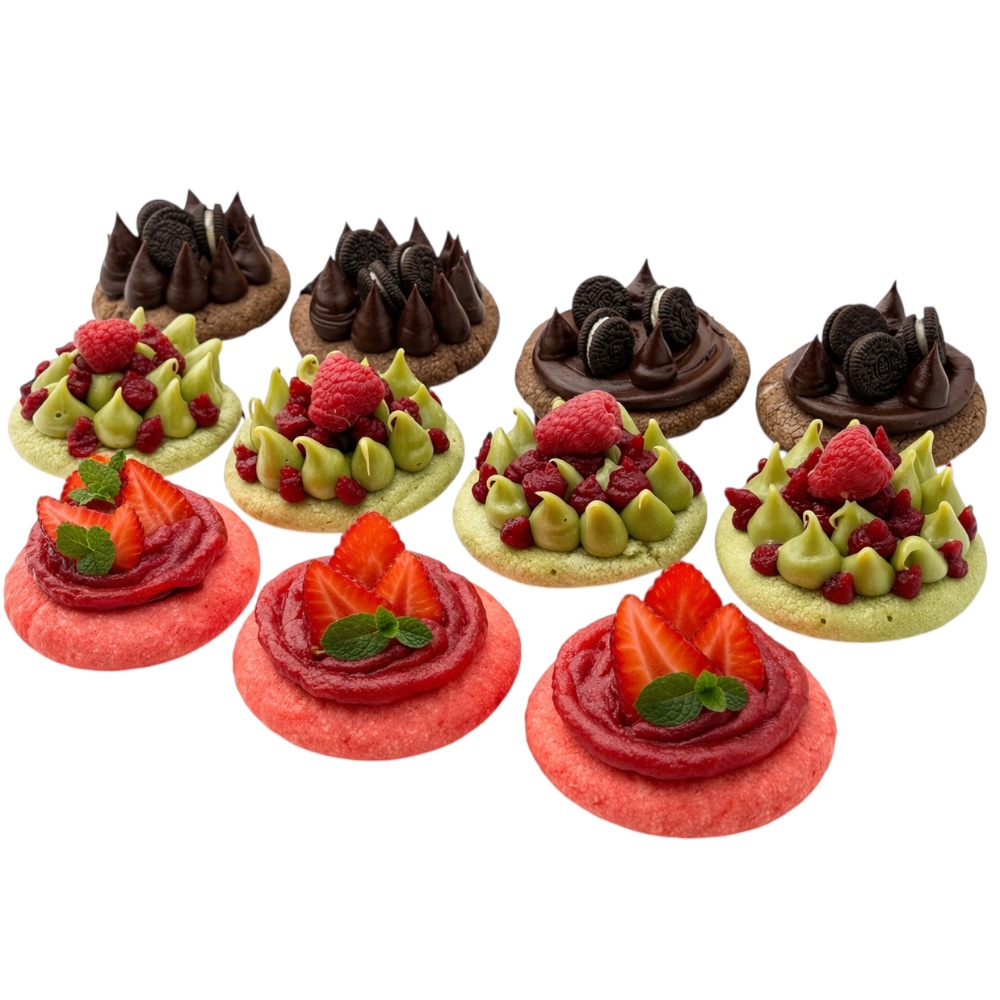 Assorted gourmet cookies with strawberry, pistachio, and chocolate flavors.