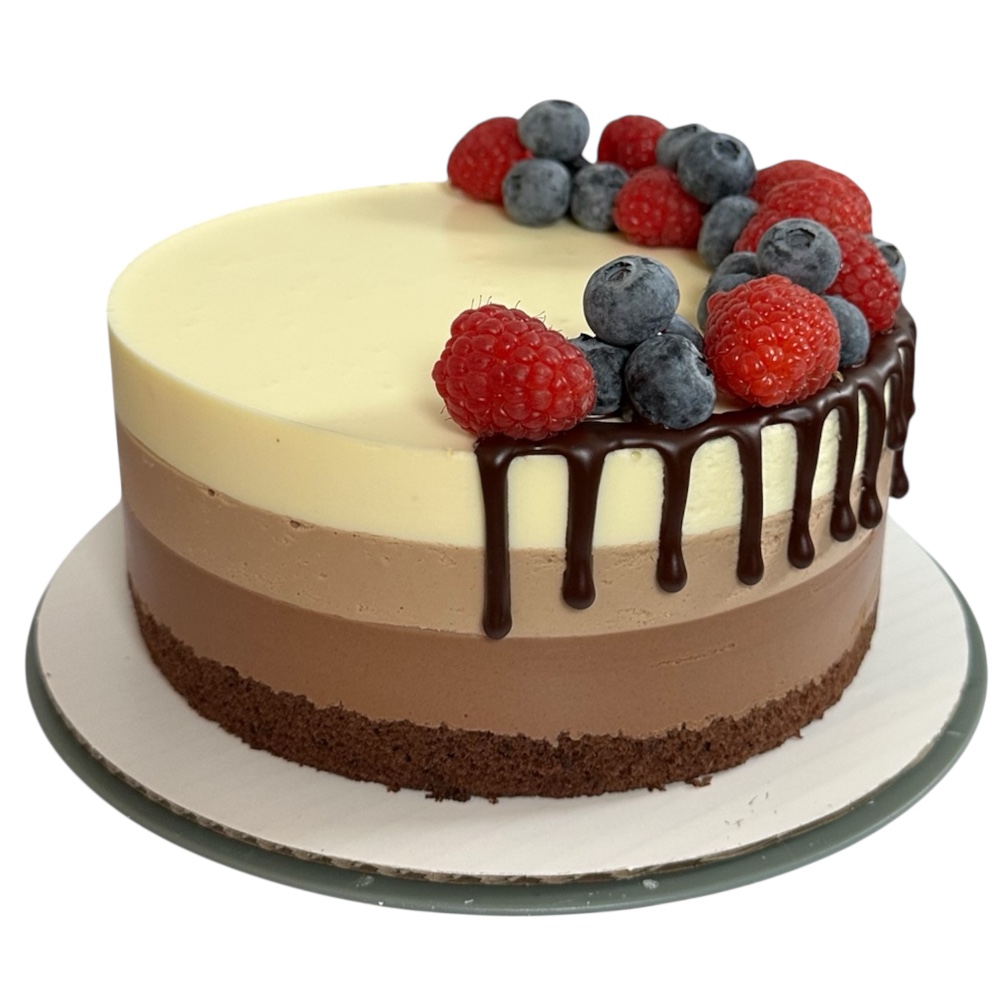 An elegant three chocolate cake made with layers of dark, milk, and white chocolate mousse.