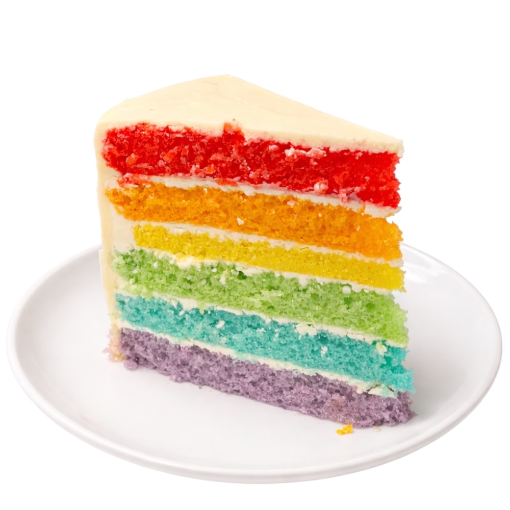 A vibrant rainbow cake made with colorful soft sponge layers and smooth cream cheese frosting.