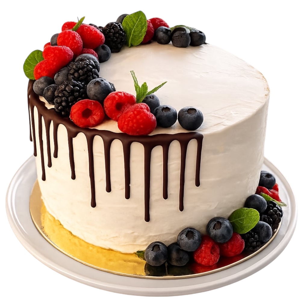 Finished with a clean, modern look, chocolate drip, and fresh berries.
