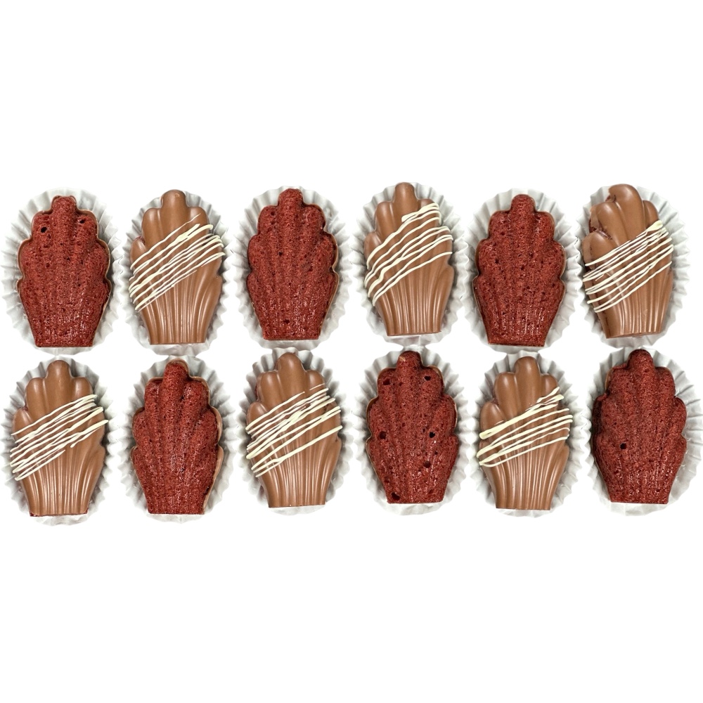 Soft red velvet madeleines with a light cocoa flavor and a tender, velvety texture.